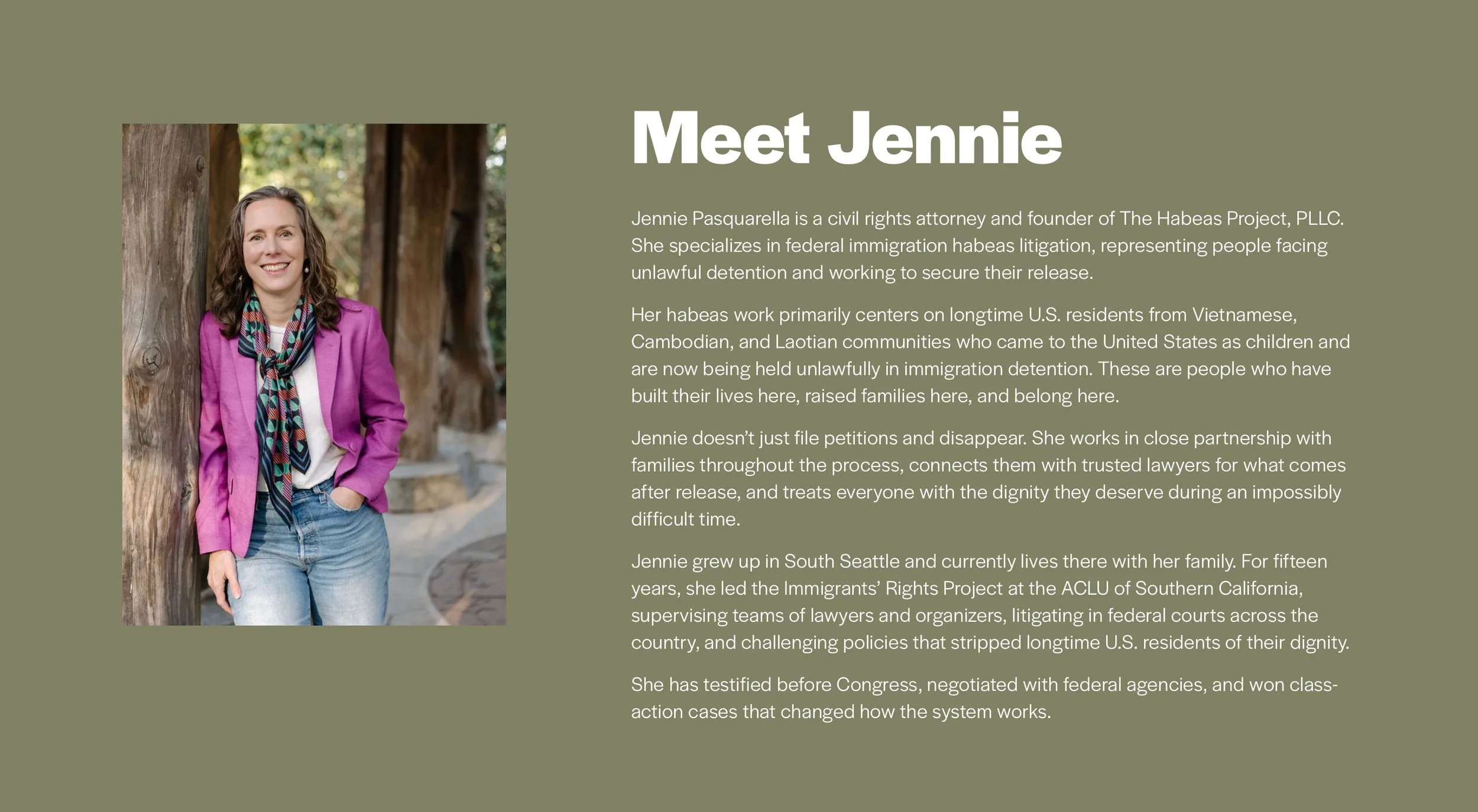 Jennie Pasquarella is a civil rights attorney who specializes in getting longtime U.S. residents released from unlawful immigration detention. She has deep expertise serving Vietnamese, Cambodian, and Laotian communities in the Seattle area.